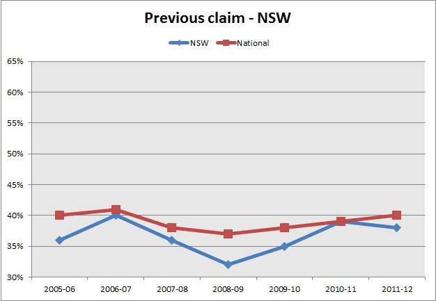 Since 2005-06 the proportion of NSW workers who had a previous claim has been at or below the national average. In 2011-12 this figure was 38%.