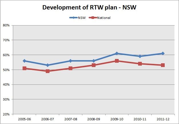 In 2011-12 61% of injured NSW workers received a RTW plan. NSW's rate remains higher than the national average and has been increasing steadily since 2006-07.