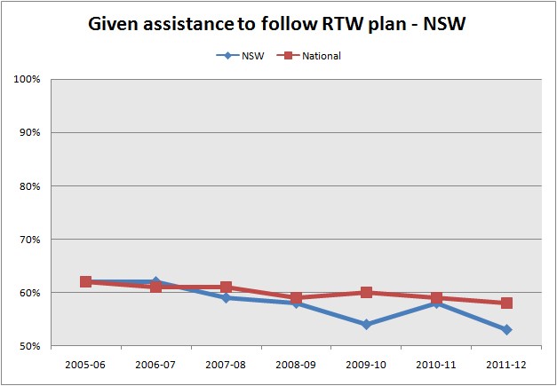 Since 2005-06 the proportion of NSW workers given assistance to follow their RTW plan has decreased by 9%, and is now 5% lower than the national average.
