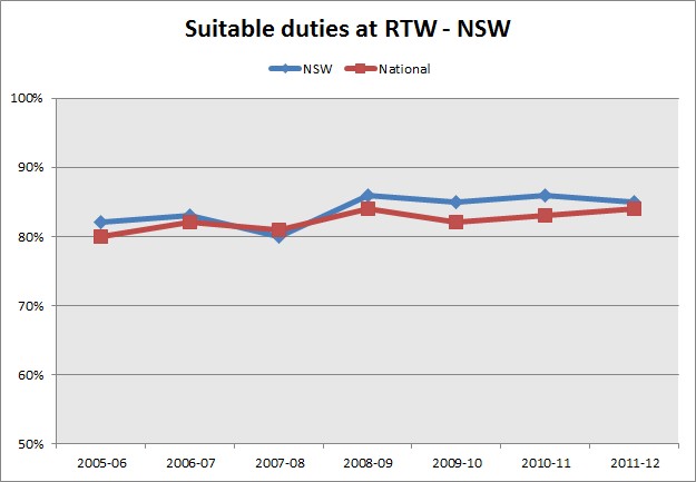 Suitable duties at return to work represents the percentage of people returning to work who considered they were given suitable duties at work.
