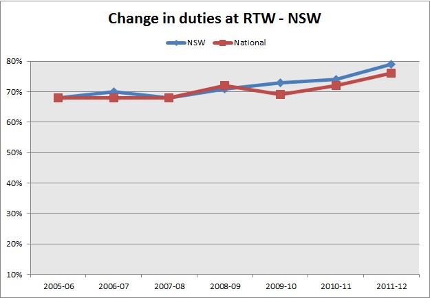 Over the last five years the number of employees returning to work on modified duties has been gradually trending upwards. In 2011-12 80% employees with an injury return to work on modified duties.