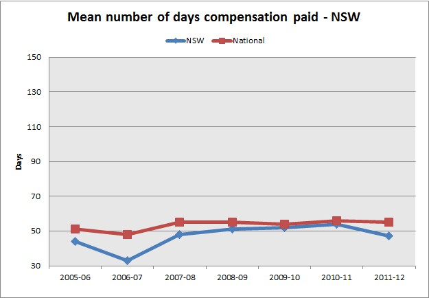 The mean number of days of compensation paid has reduced over the last year, and is now less than the national average.