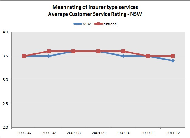 NSW's average insurer customer service rating has been identical to the national average for five out of the last seven years. The average customer service rating has declined over the last three years.