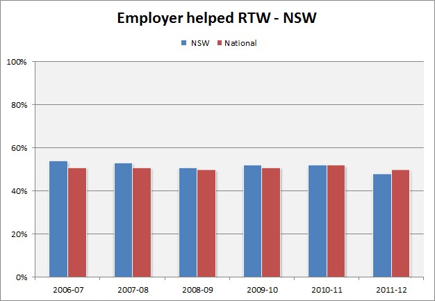 In 2011-12 47% of employees considered their employers helped RTW. This is down from 52% six years ago. The 2011-12 result is lower than the national average.