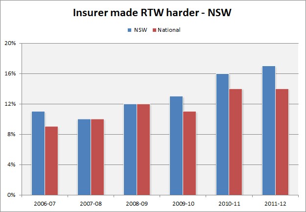 2011-12 saw a slight increase in the percentage of injured NSW workers who indicated the insurer made return to work harder