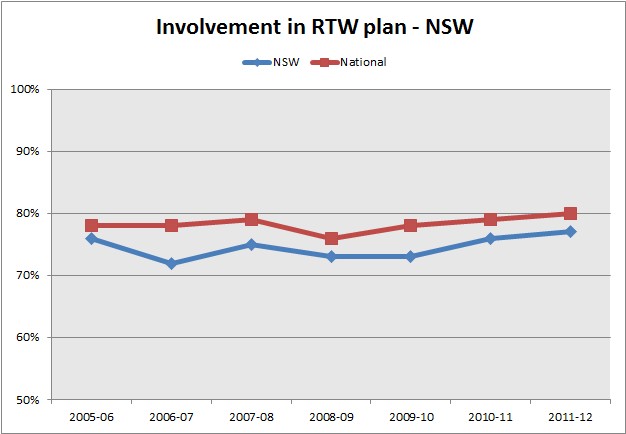 77% of NSW employees with a RTW plan were involved in development of that plan. The results have remain below the national average.