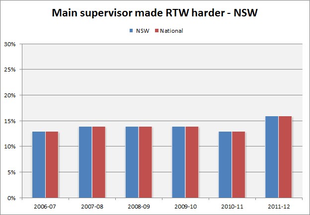In 2011-12 16% of NSW employees interviewed felt their main supervisor made return to work harder. This has increased over the last 12 months.