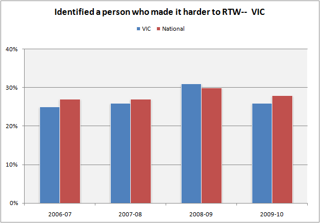 Over the last 12 months there has been a substantial drop in the percentage of injured Victorians who identified a person who made return to work harder. The percentage has dropped from 31% to 26%, a reduction of 5%. The Victorian results show less Victorians than the national average identify someone who has made return to work harder.