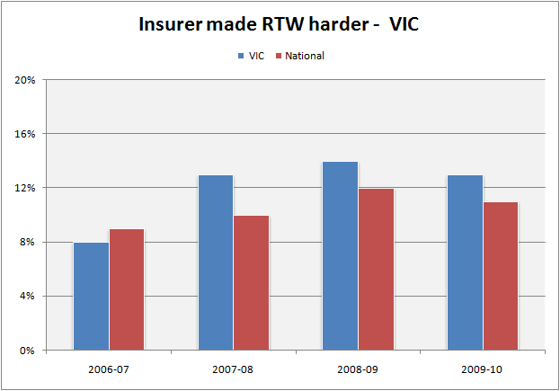 Between 2006-07 and 2008-09 the percentage of injured Victorians who indicated the insurer made return to work harder close to doubled (the figure was up by 80%).